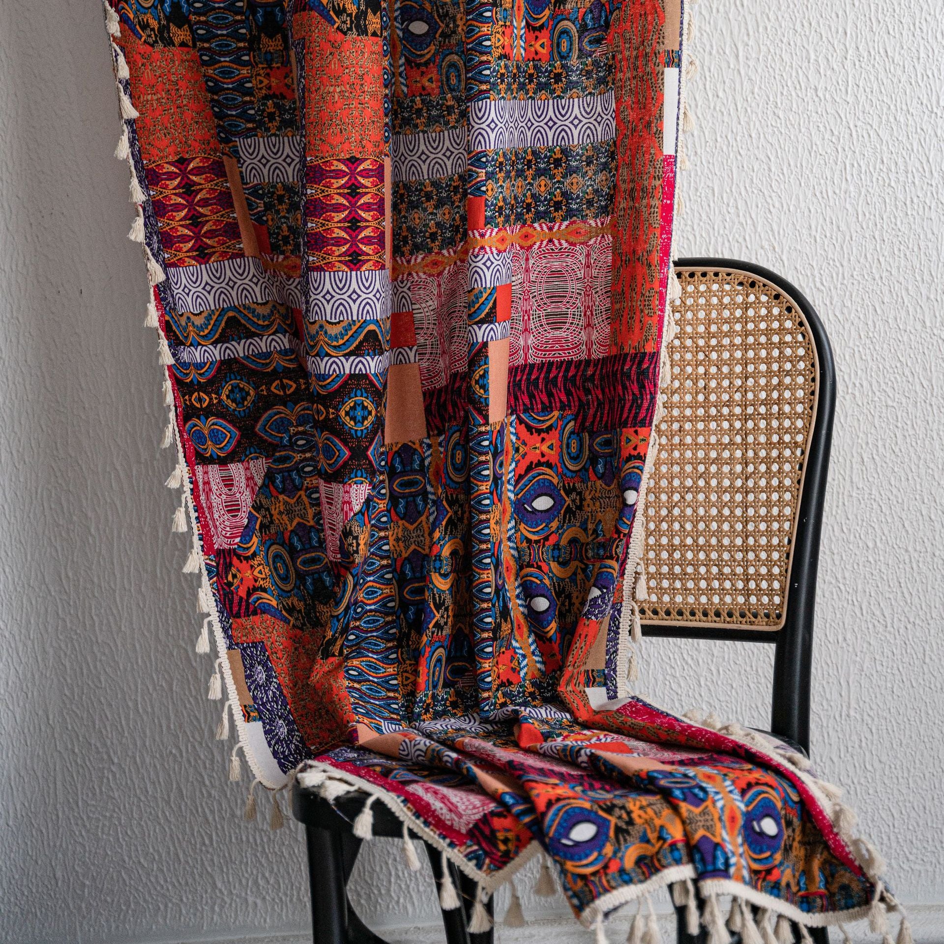 The chic patchwork of geometric prints in varied red and blue shades infuses a boho appeal into any setting.