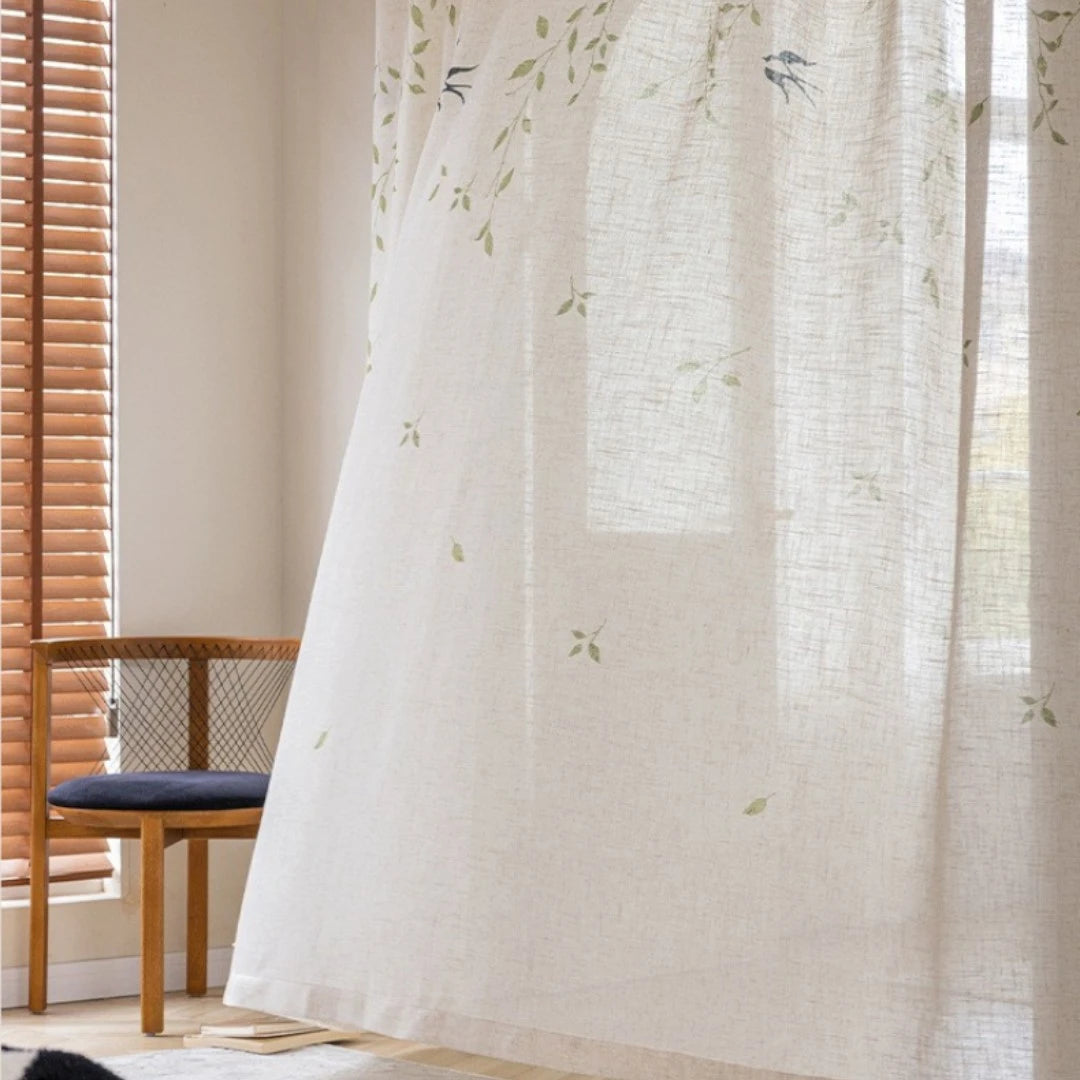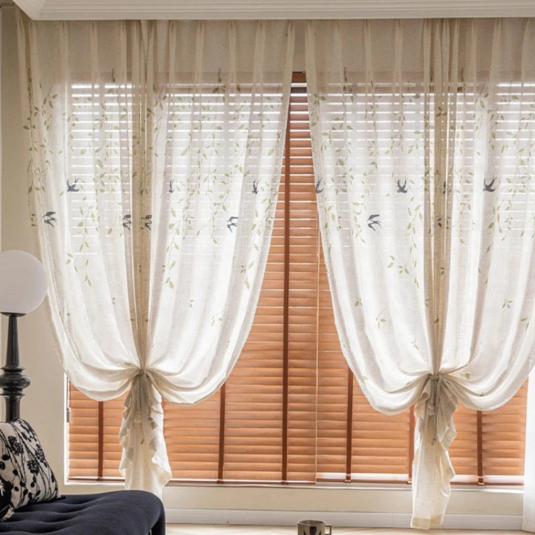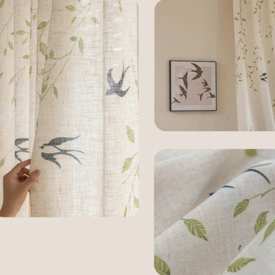 Dark gray swallow silhouettes fly across the fabric, creating a peaceful outdoor scene right inside your home.
