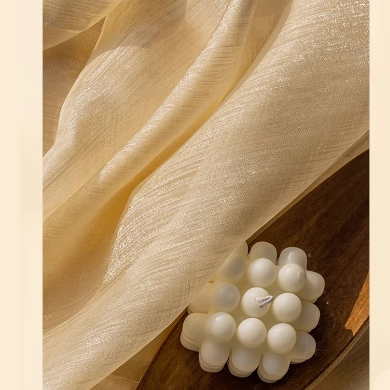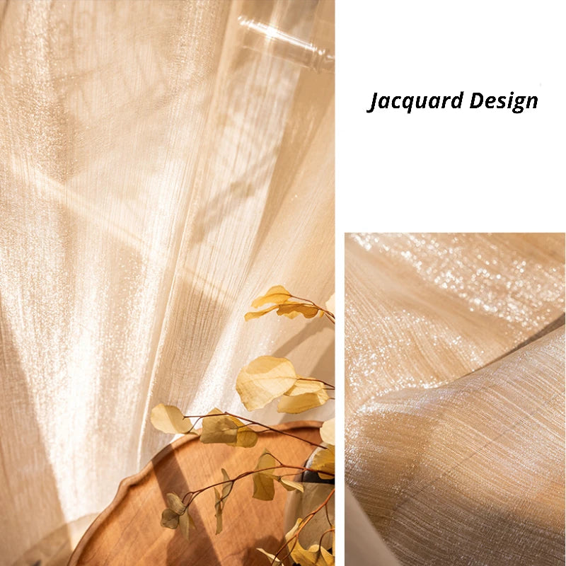 The Lillian Gold Gauze Jacquard Sheer Custom Curtain transforms your room with a magical golden glow.