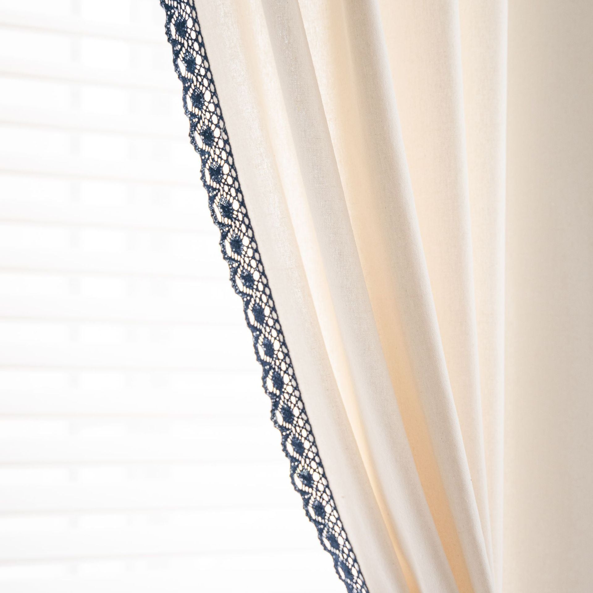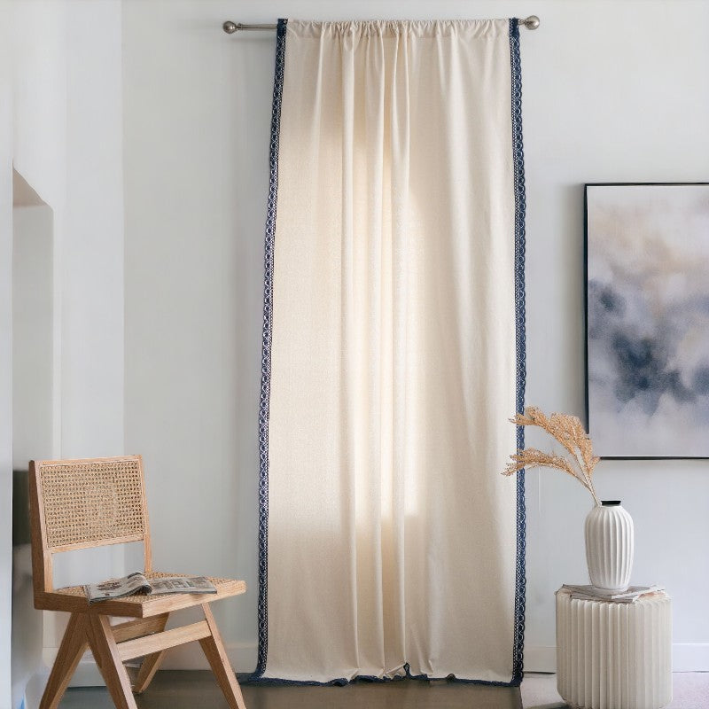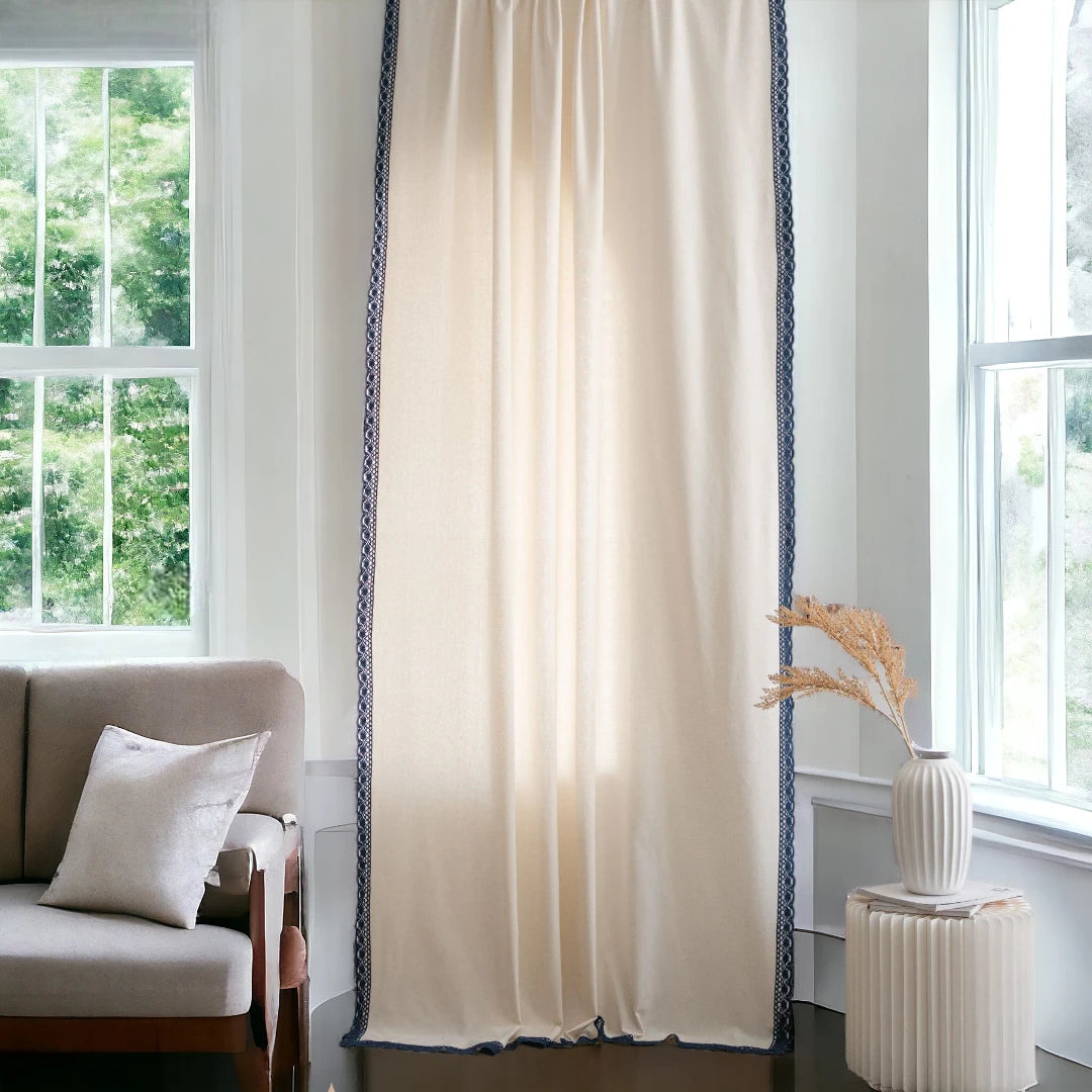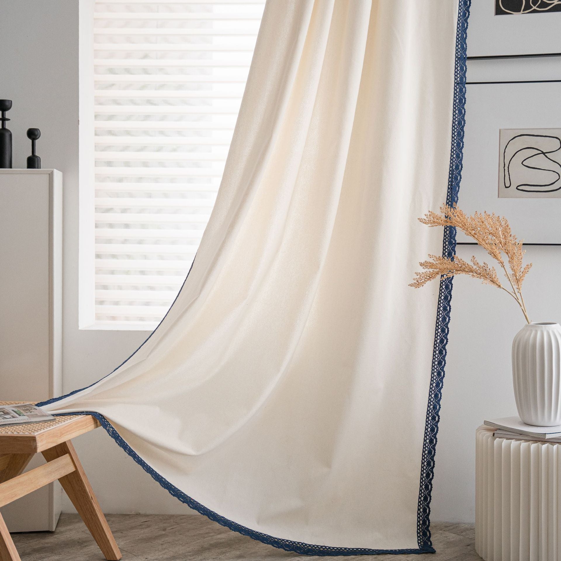Erleben Sie die Eleganz unseres Marina Solide Weißen Lichtdurchlässigen Vorhangs nach Maß. Dieser atemberaubende Vorhang in reinem Weiß, verziert mit zartem blauem hohlem Blumenbesatz an beiden Seiten und unten, wird zum Inbegriff raffinierter Schönheit.
