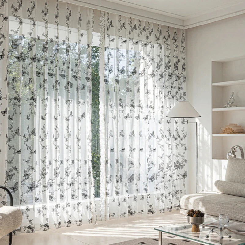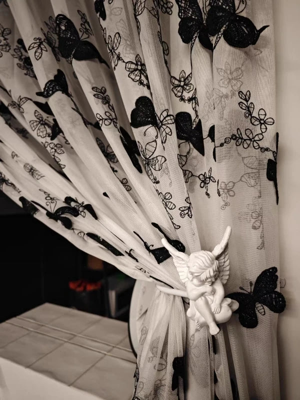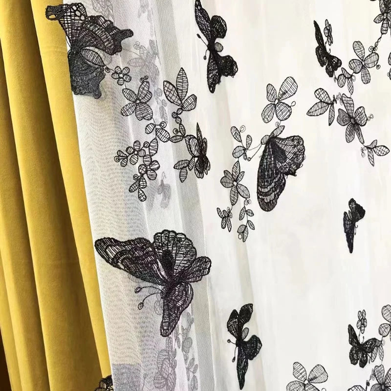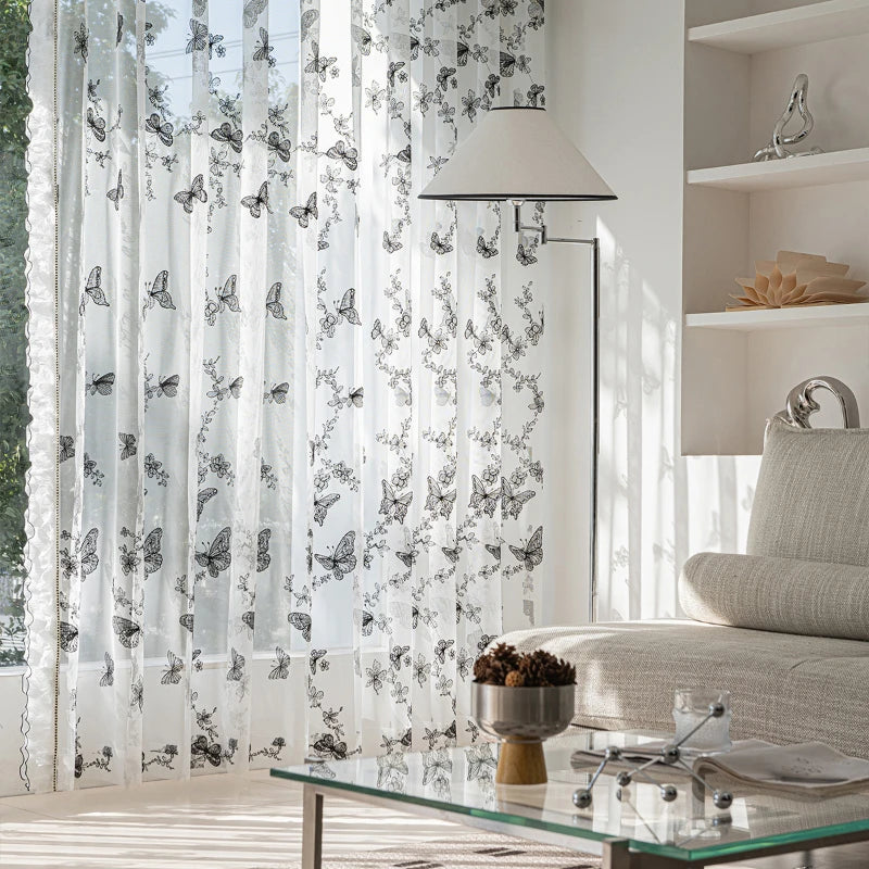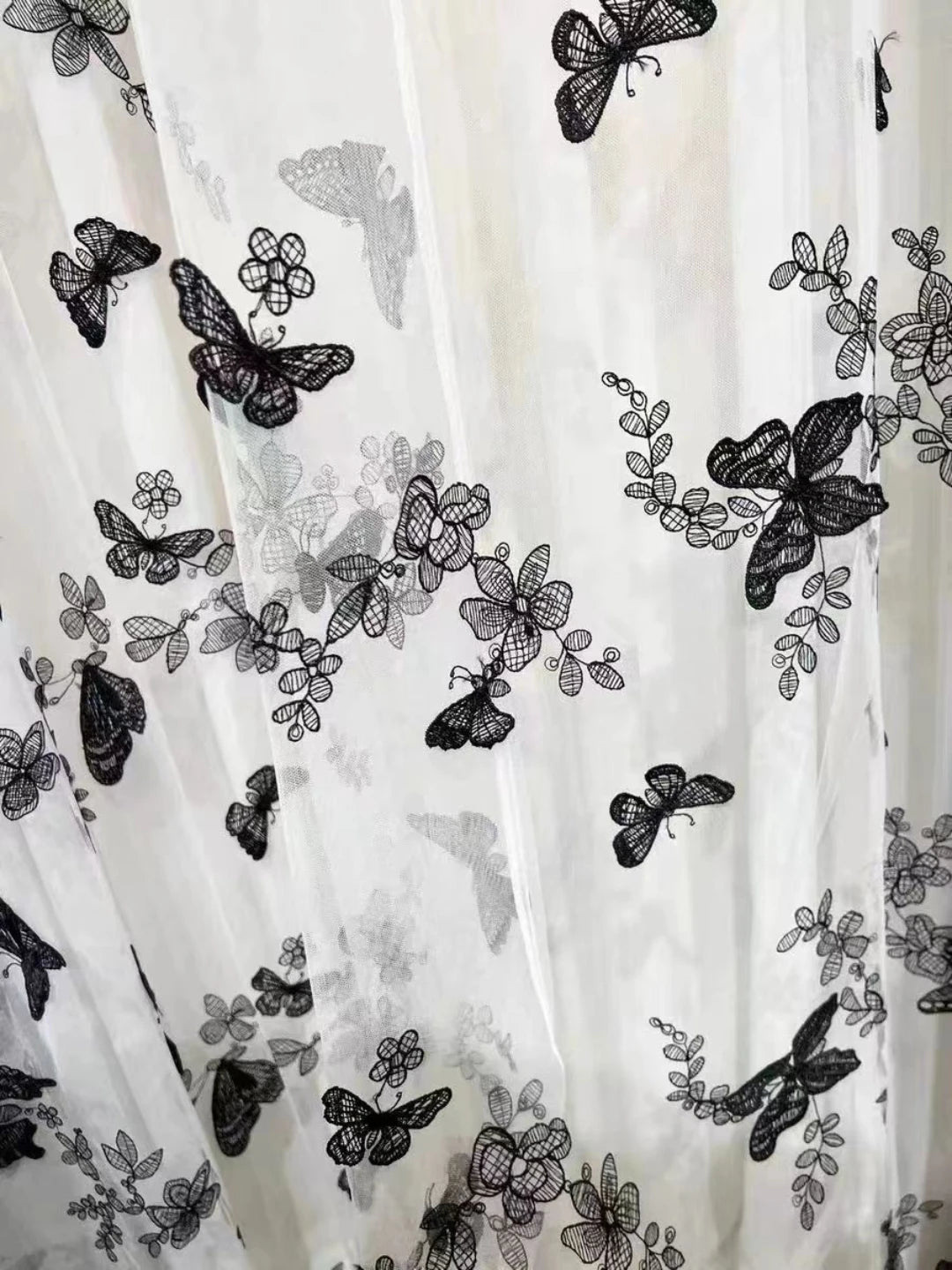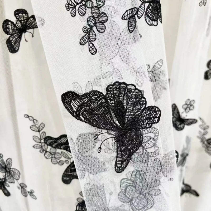 This sheer curtain showcases intricate butterfly and floral embroidery stitched in contrasting black thread against a translucent voile base.