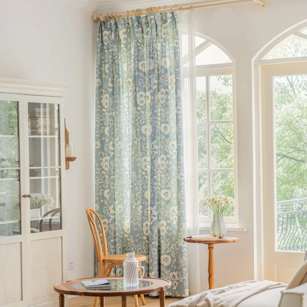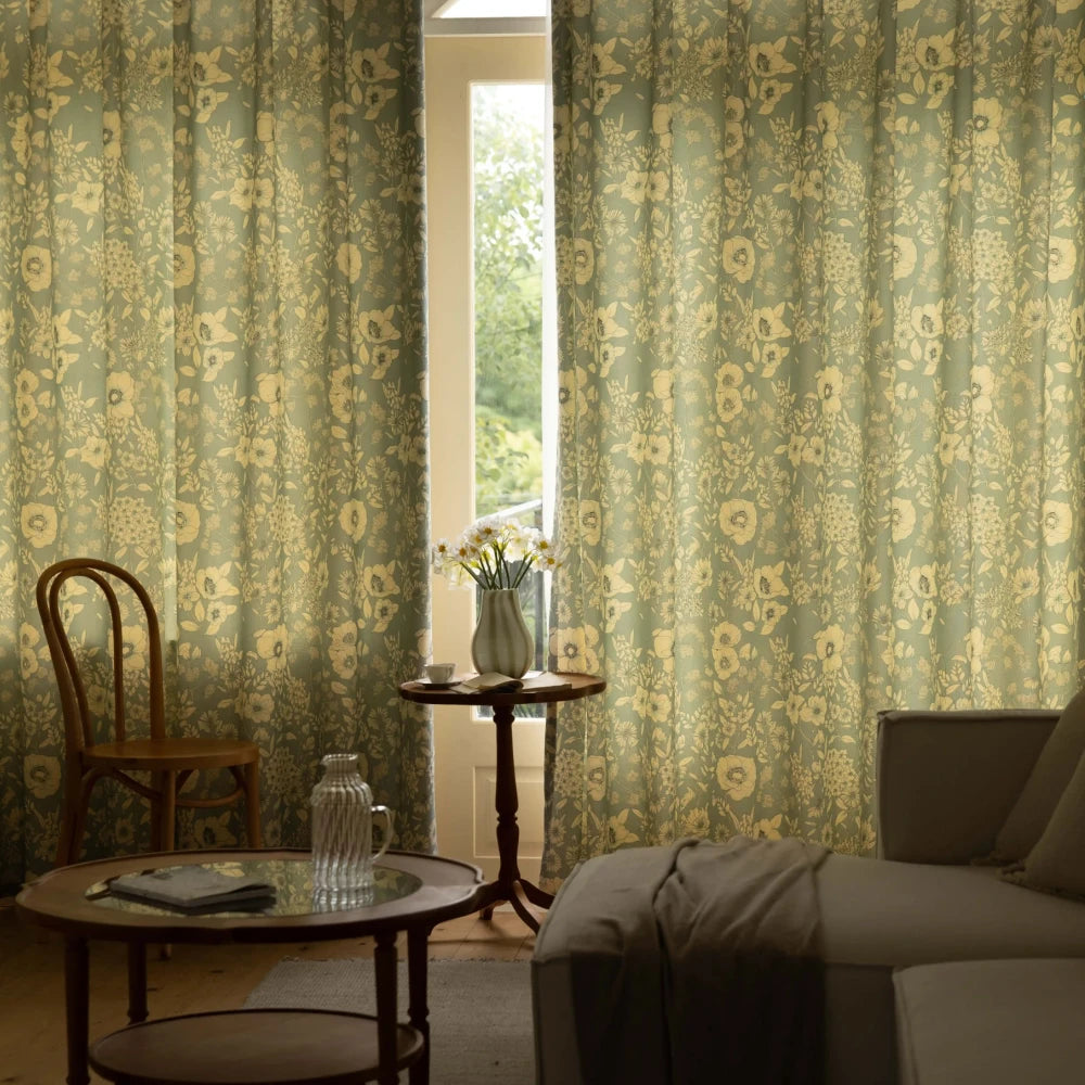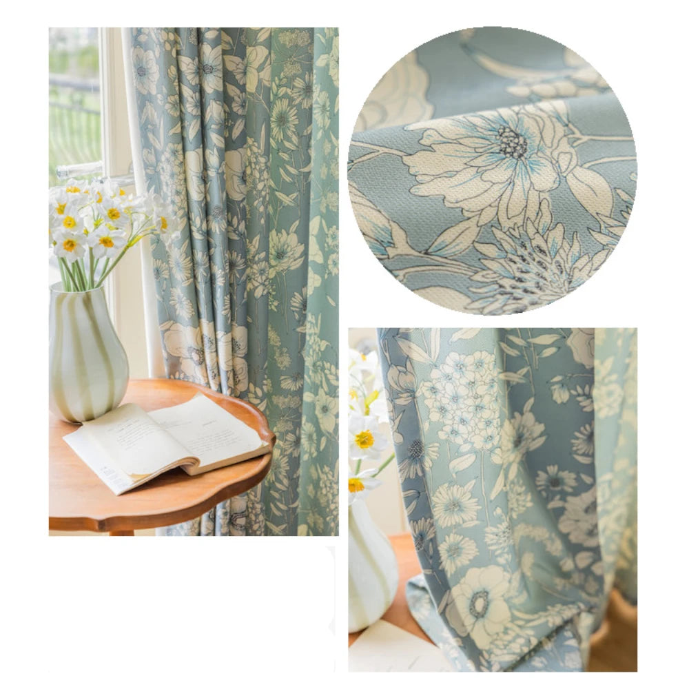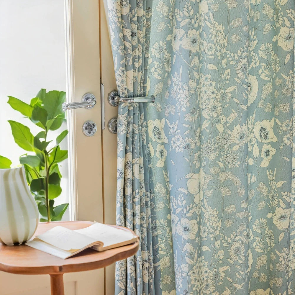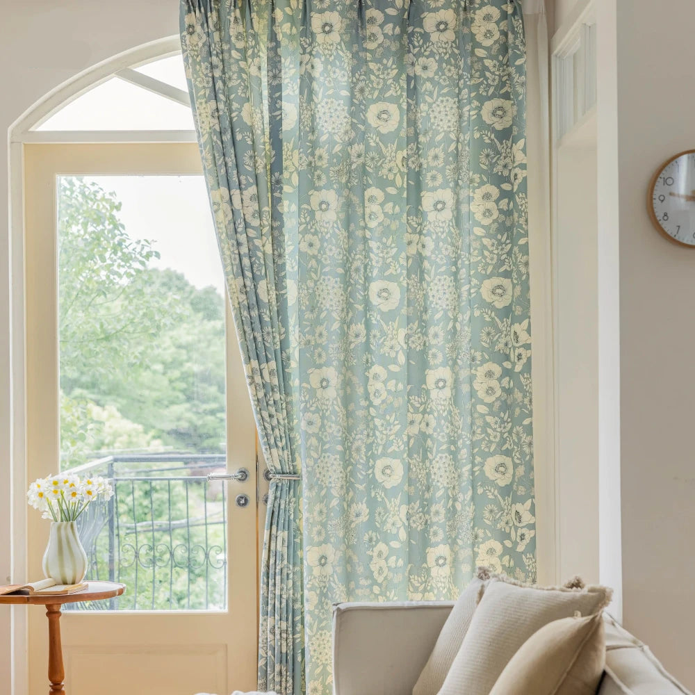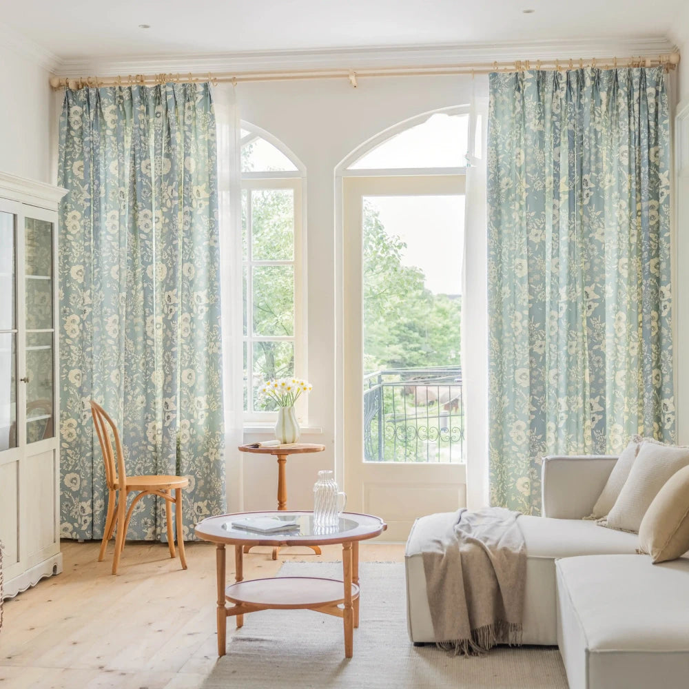 Le doux fond bleu œuf de canard de nos rideaux Mara Vintage Floral peint une scène de campagne française de rêve dans votre maison.