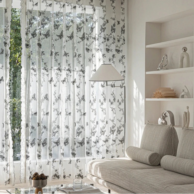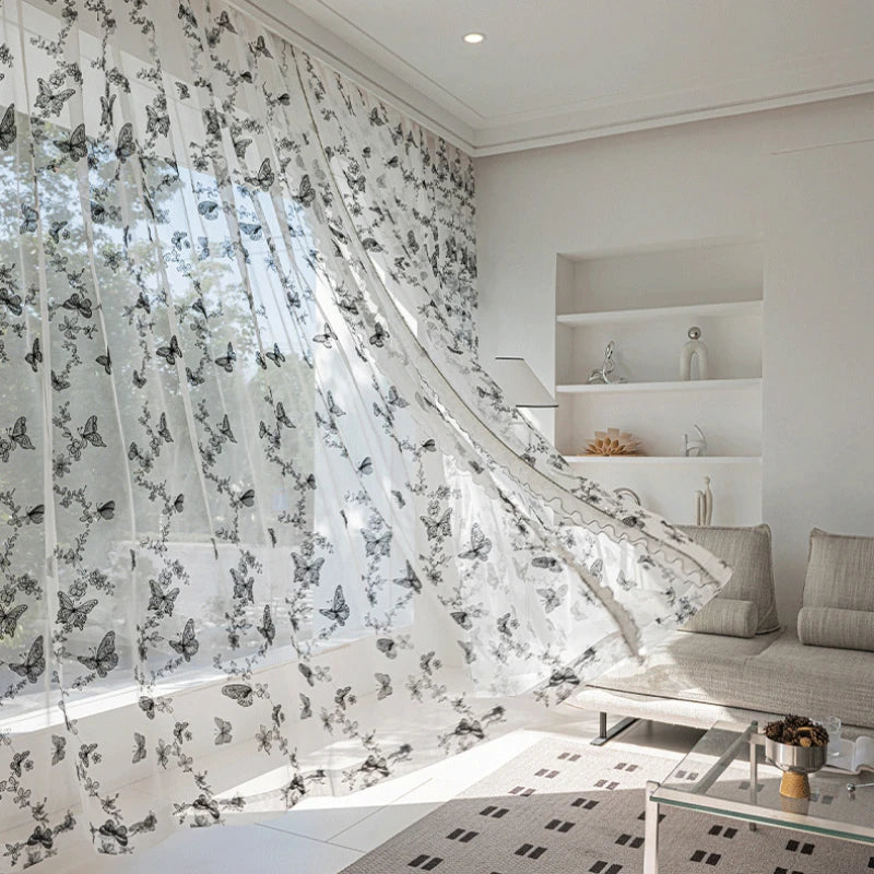 Ce rideau transparent présente une broderie complexe de papillons et de fleurs cousue avec un fil noir contrastant sur une base de voile translucide.