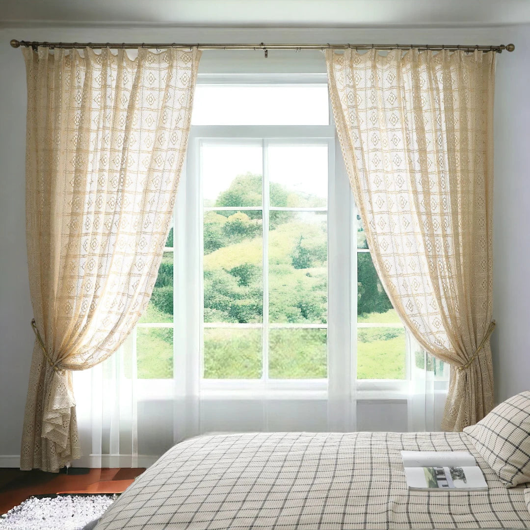 L'élégance du rideau est rehaussée par les fleurs brodées au crochet, qui s'harmonisent parfaitement avec le design ajouré du rideau, créant un voyage éthéré de lumière et d'intimité.