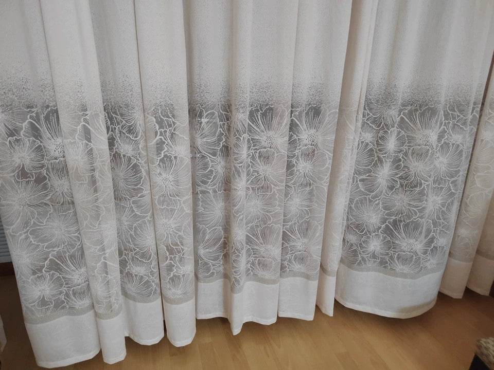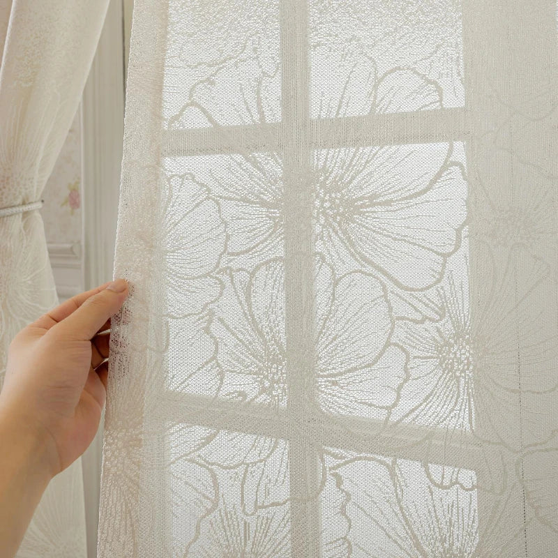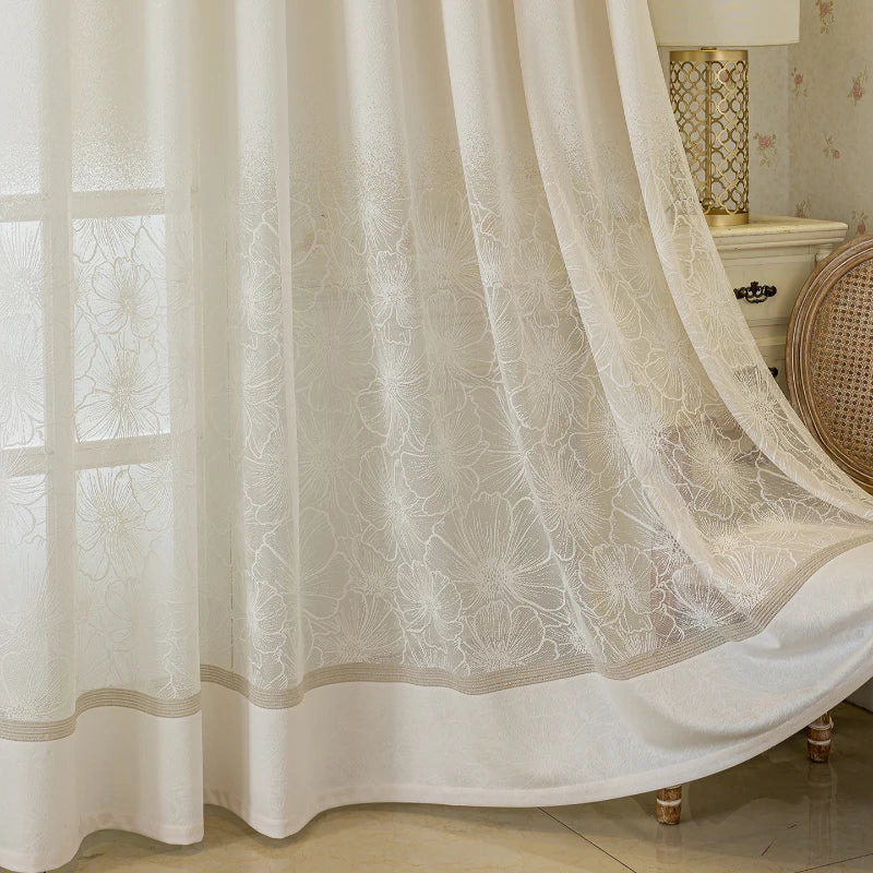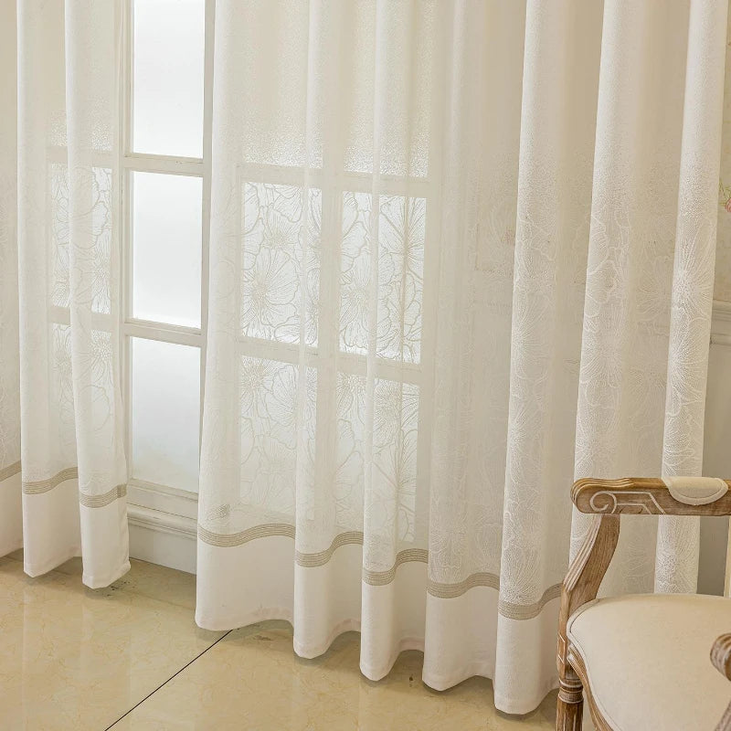 The white gauze base lets natural light dance through while the floral details add visual interest.