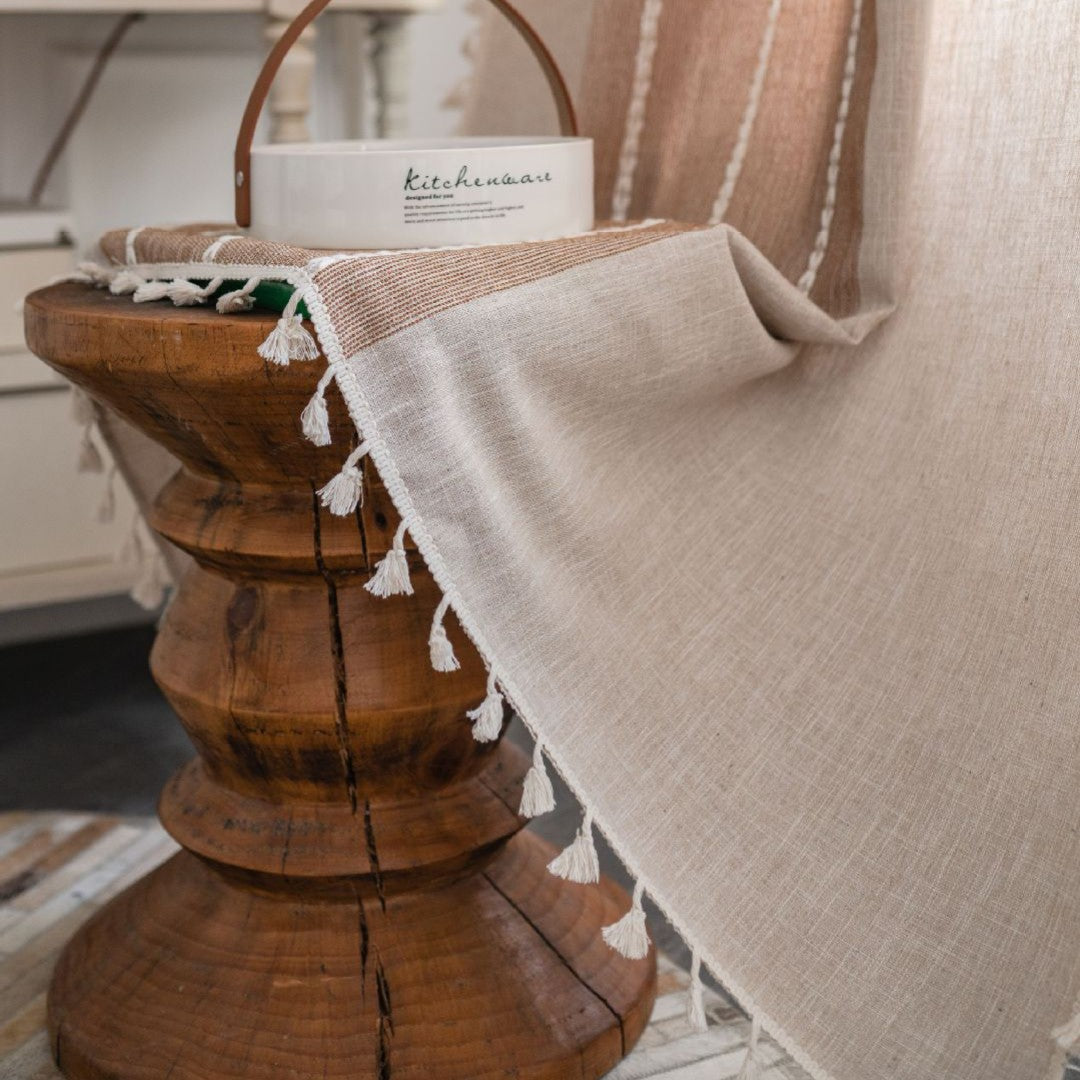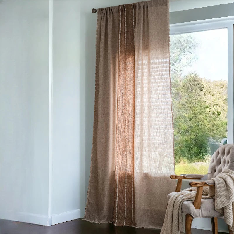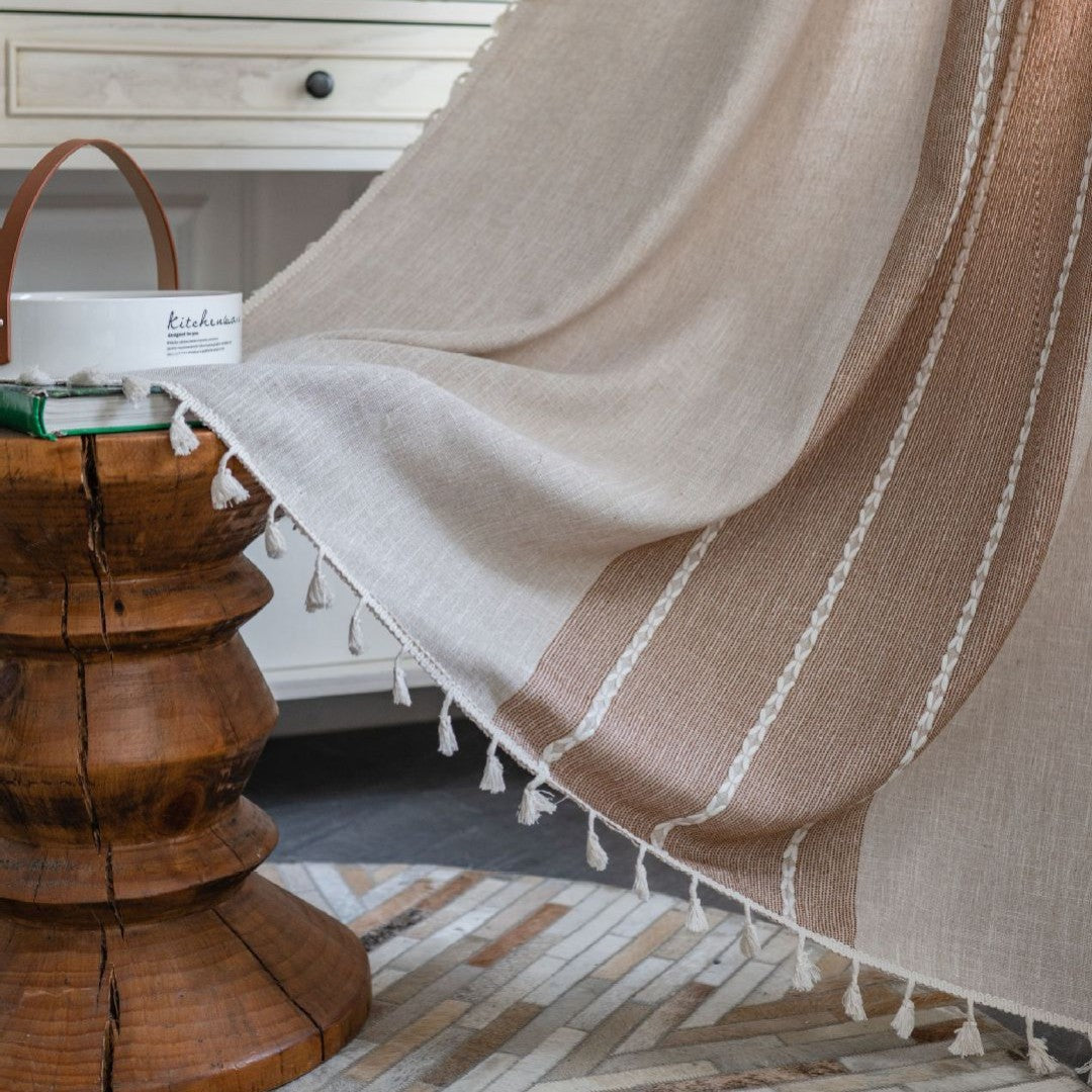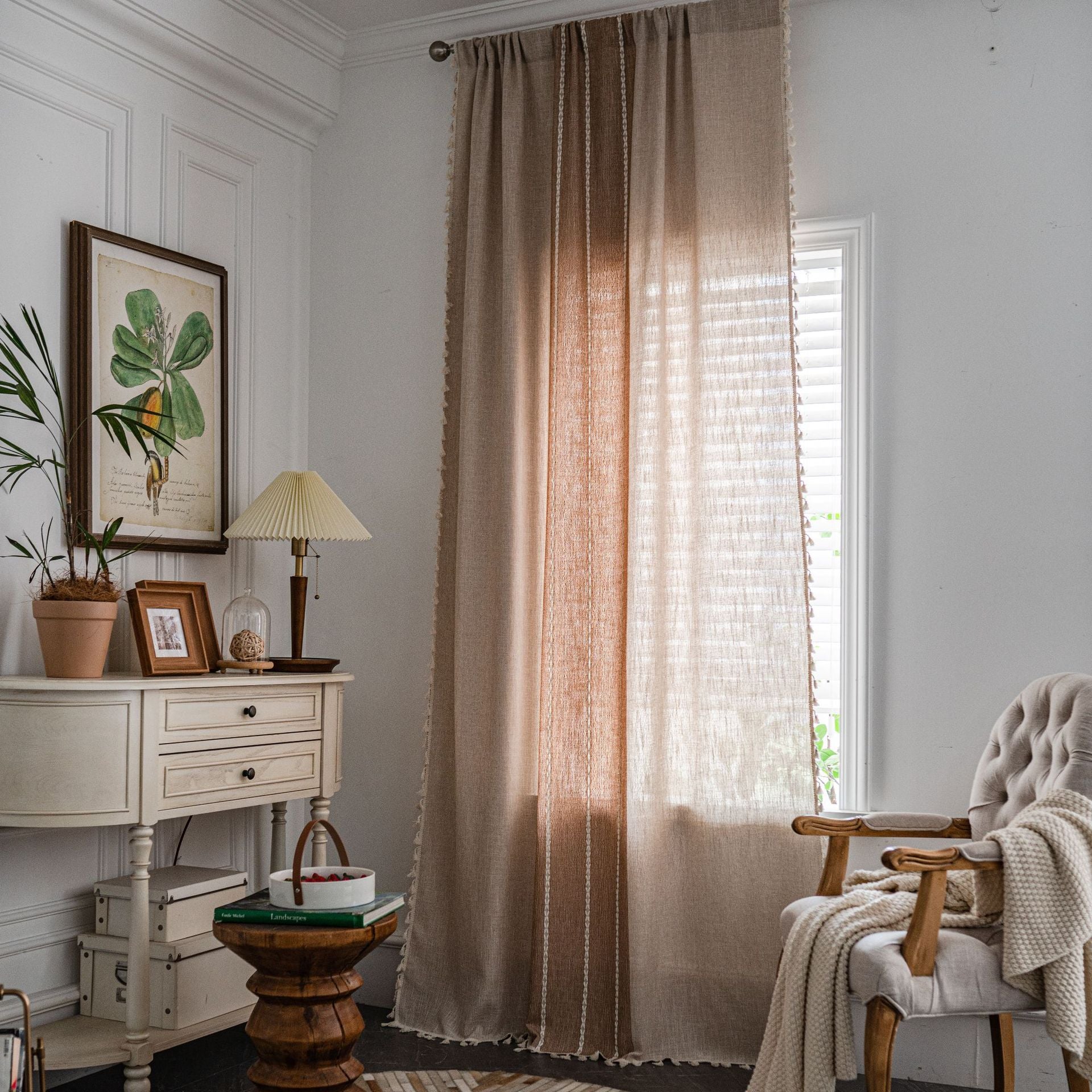 それだけでなく、白いトリムと両側および下部の遊び心のある白いタッセルが、単なるカーテン以上のものにし、空間に温かみとエレガンスをもたらすアートピースとなっています。