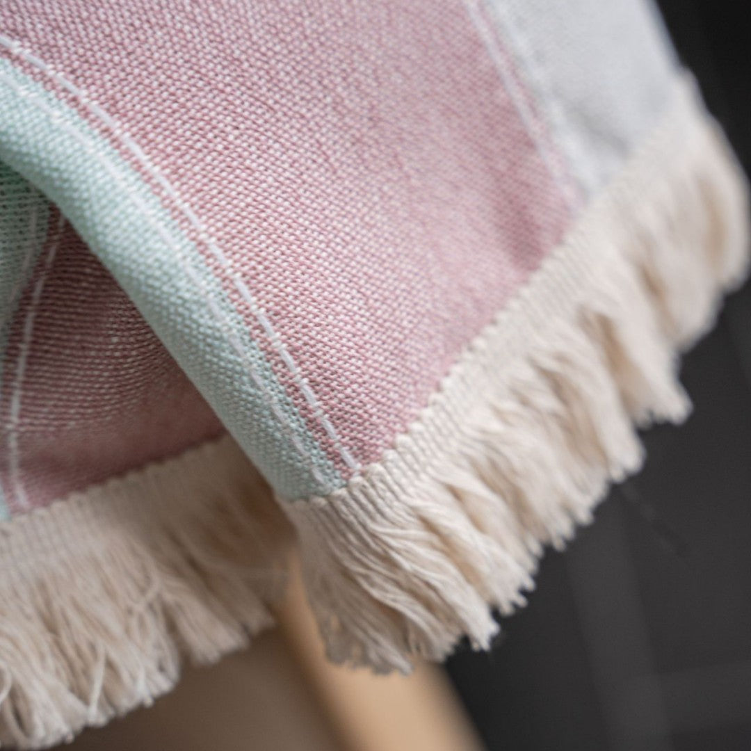 クリーム、スカイブルー、ピンクのエレガントなカラーパレットが美しいパッチワークとなり、魅力的なカラーブロックの特徴を作り出しています。