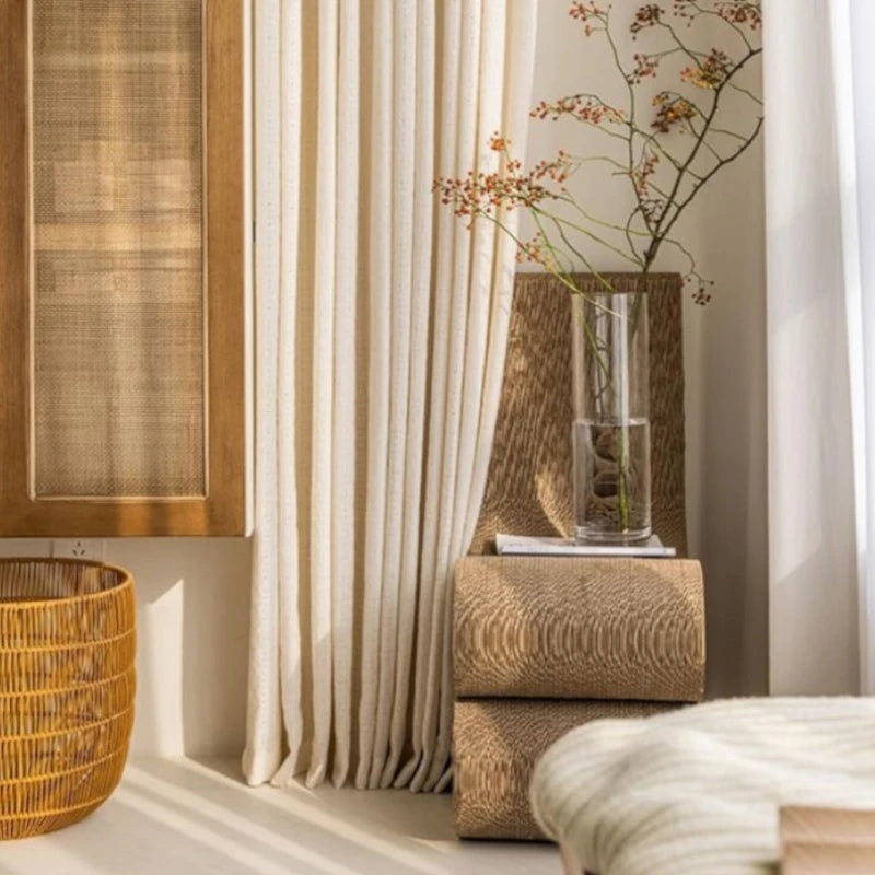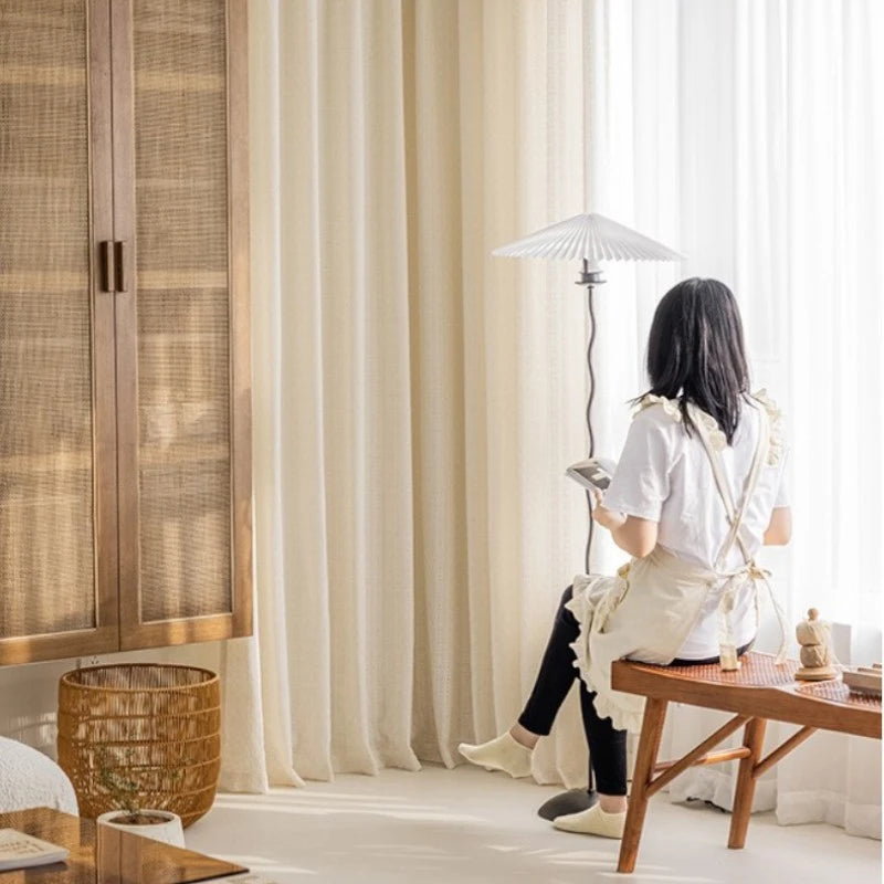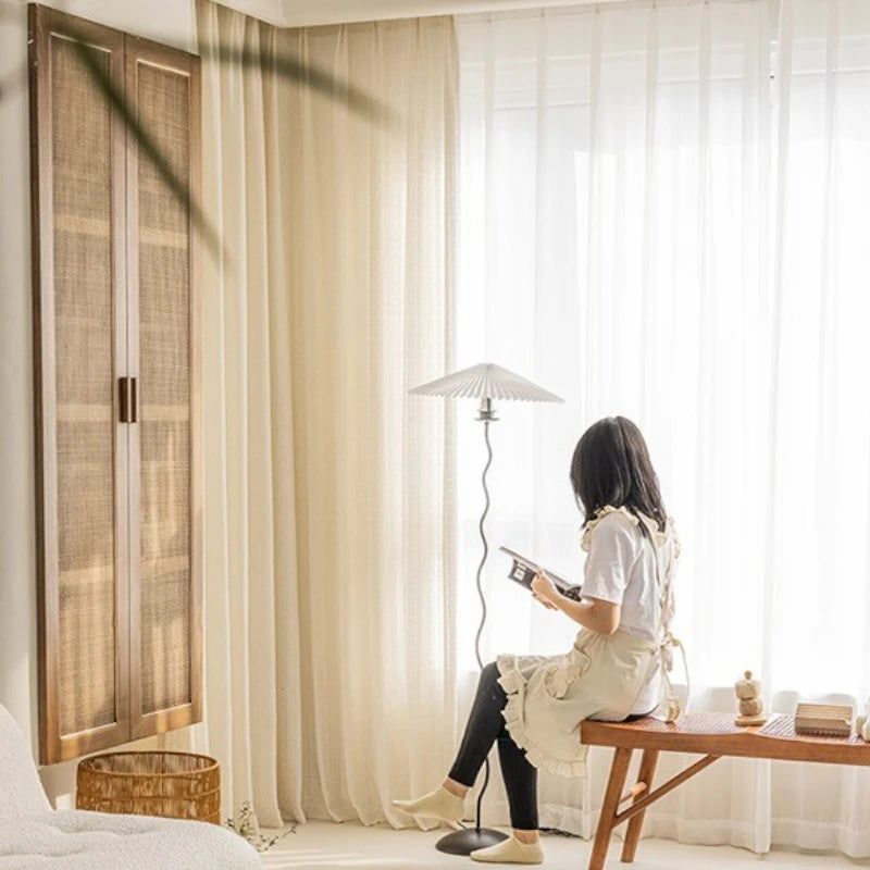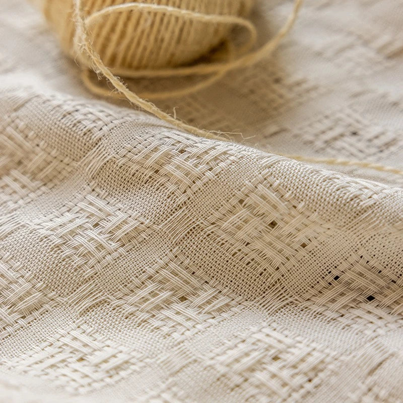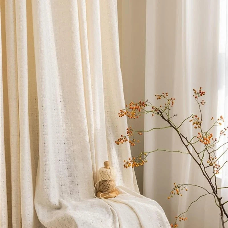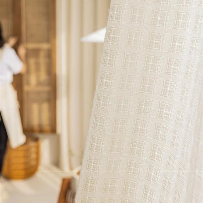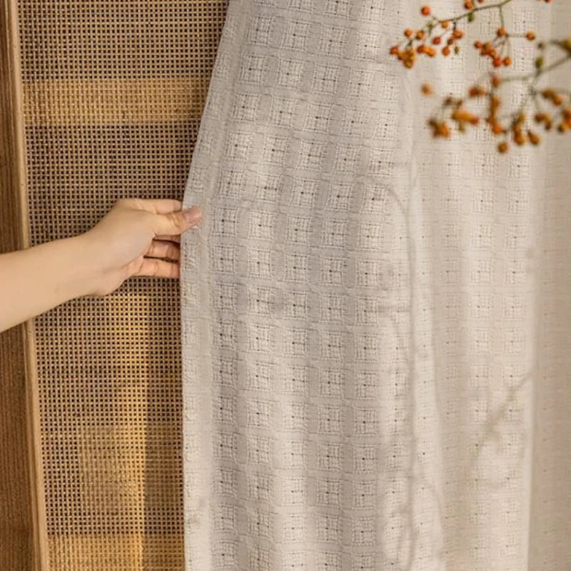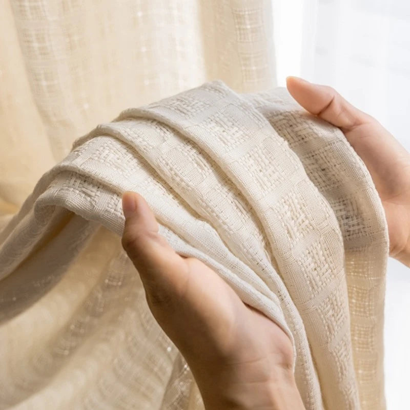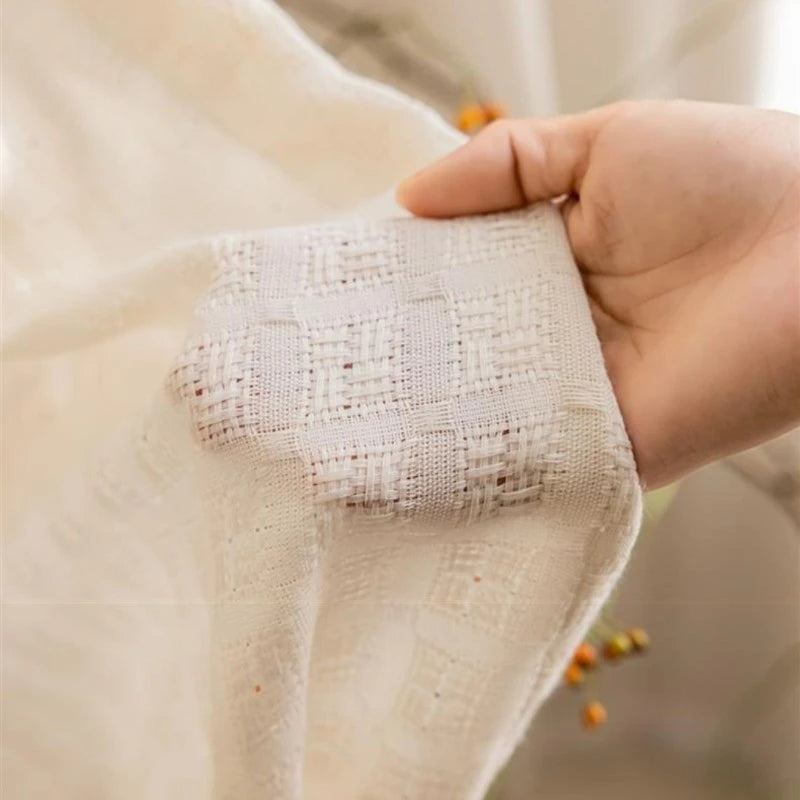 プレミアムコットンの織り目が透明度の異なる繊細な四角形を作り出し、視覚的な奥行きを加えつつ日光を調整します。これらのカーテンは、午後の強い日差しが差し込む南向きの部屋で特に効果を発揮します。