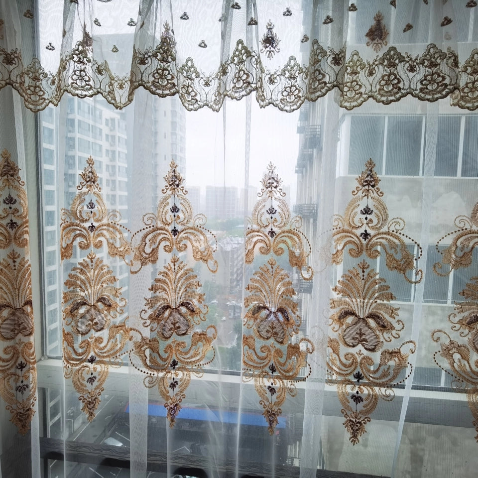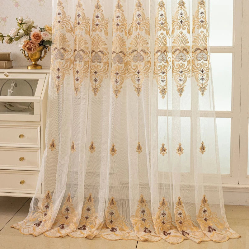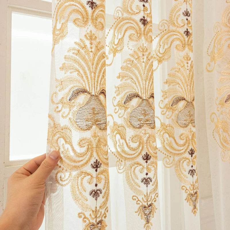 The Carla Versailles Gold Embroidered Custom Sheer Curtain transforms your windows into works of art.