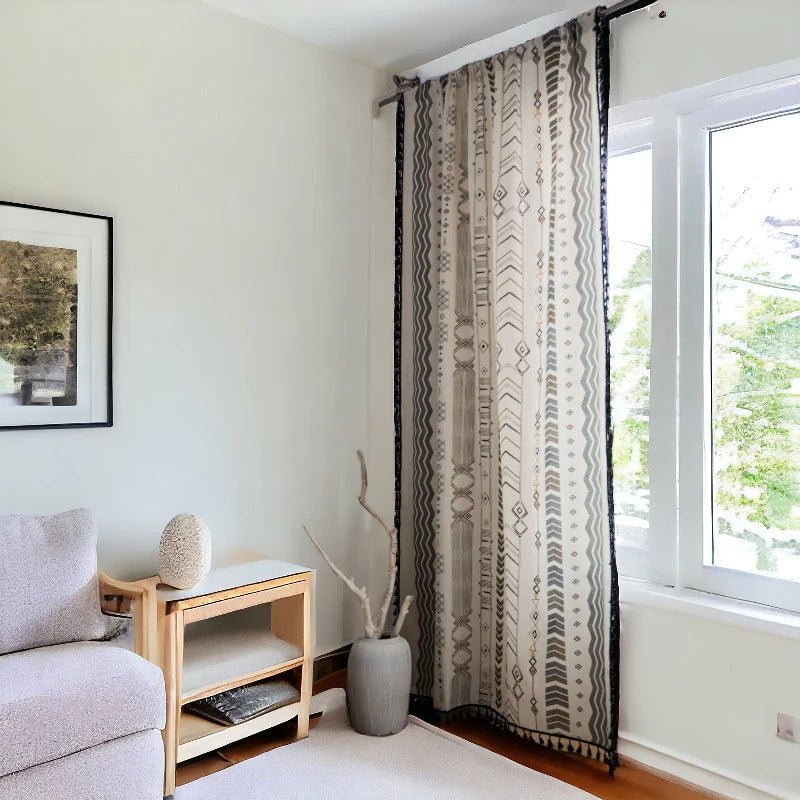 Complementada pelo seu elegante acabamento preto e franjas, a cortina Kambria traz uma vibração boémia contemporânea ao seu espaço.