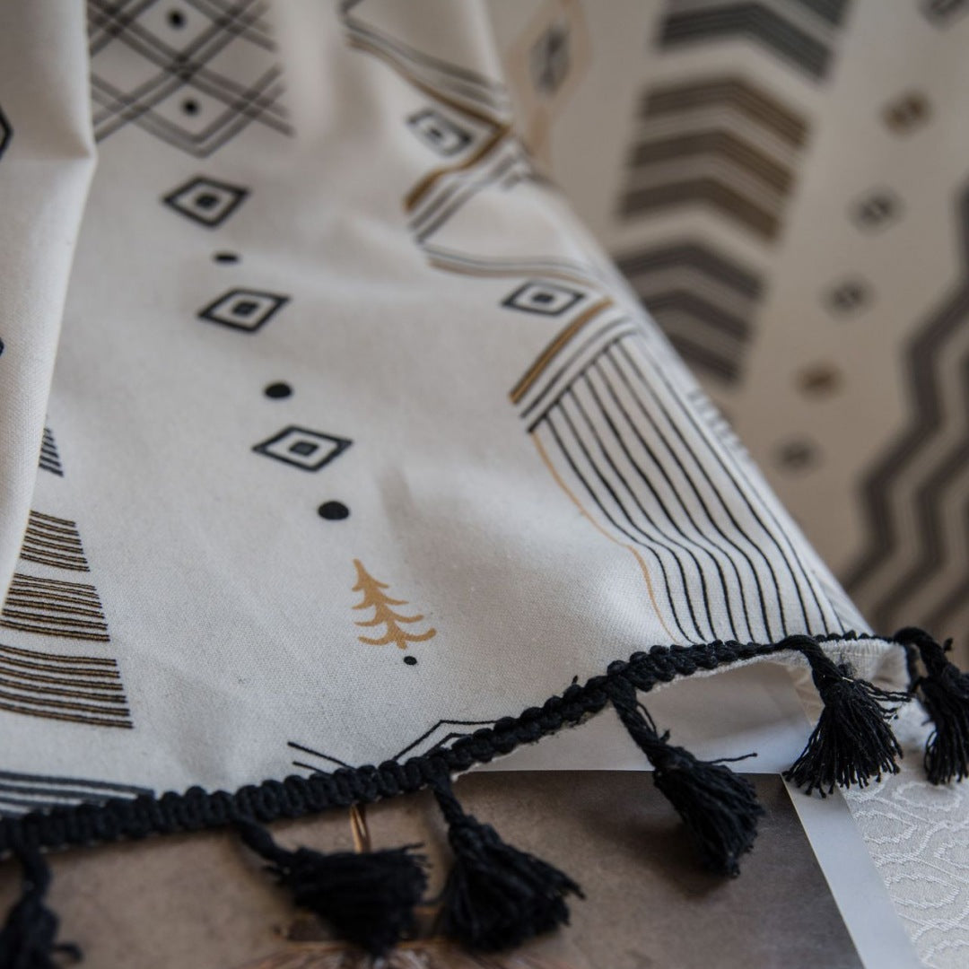 Irradiando um tom marfim elegante, esta cortina boémia semi-transparente é adornada com padrões geométricos em cinzento, castanho e laranja.