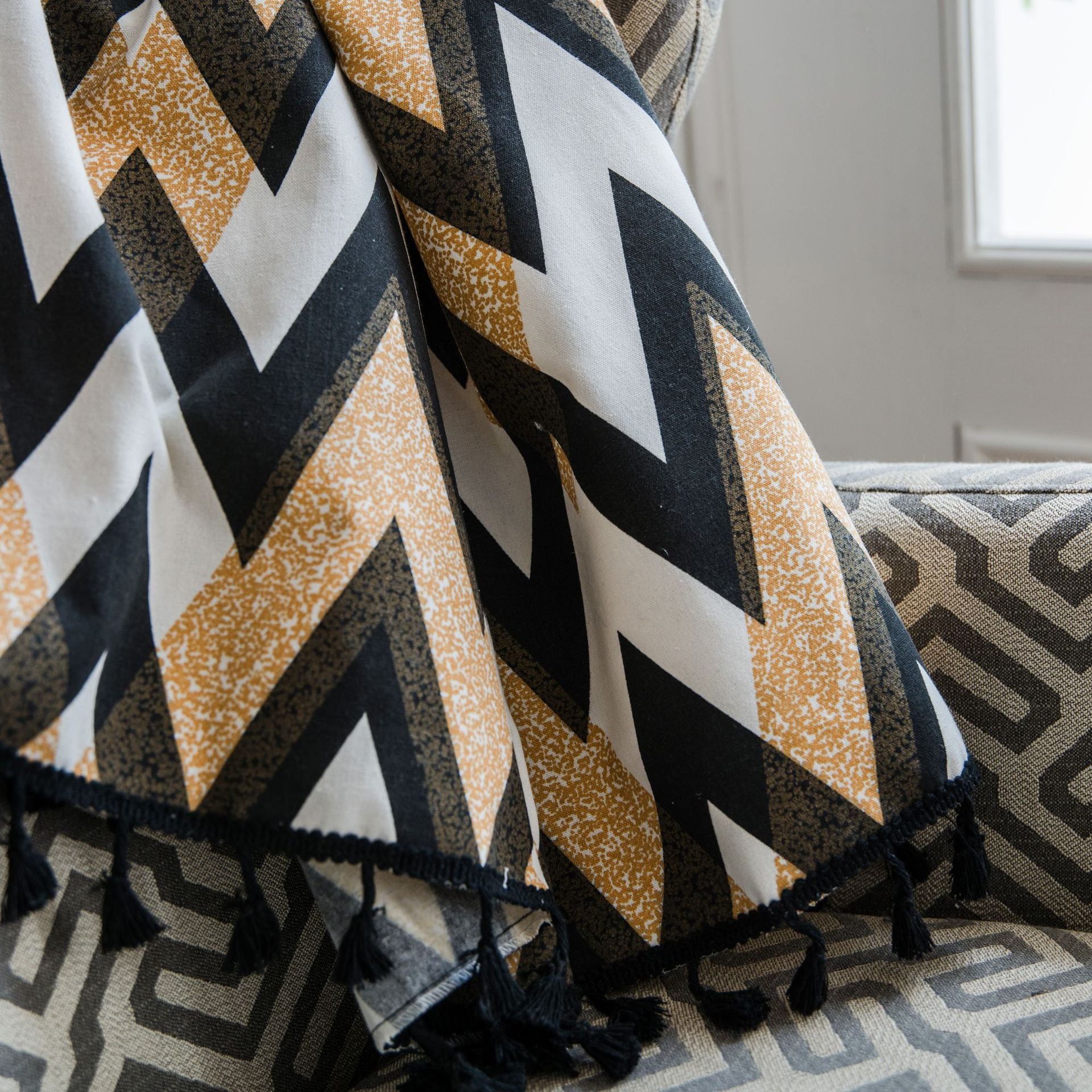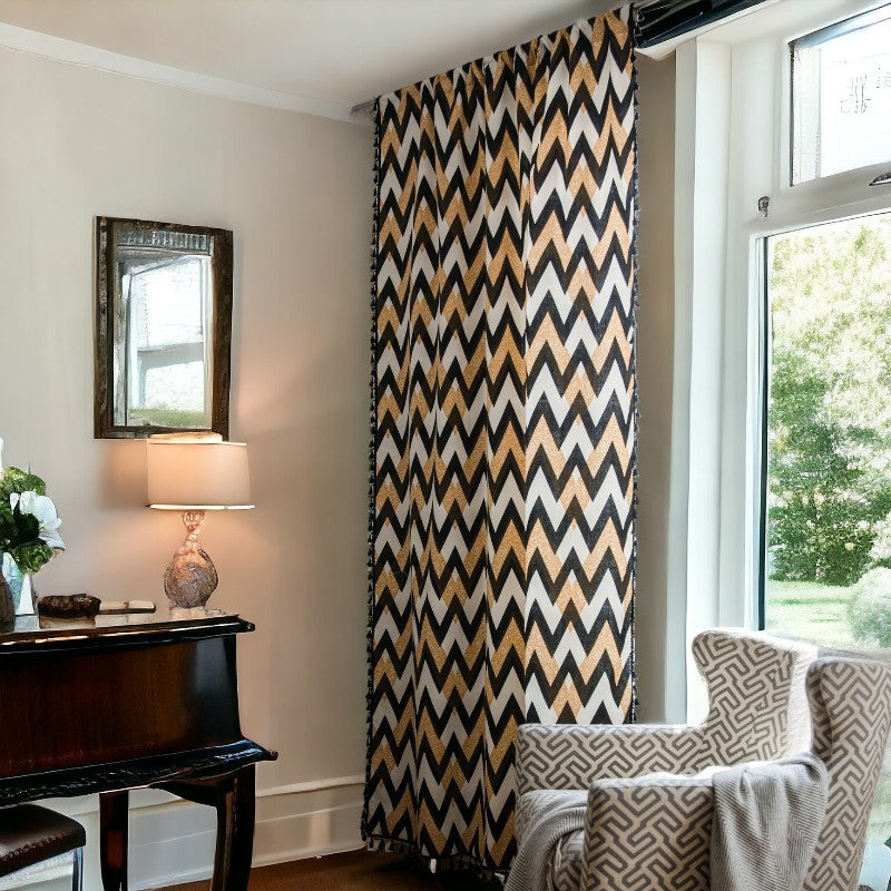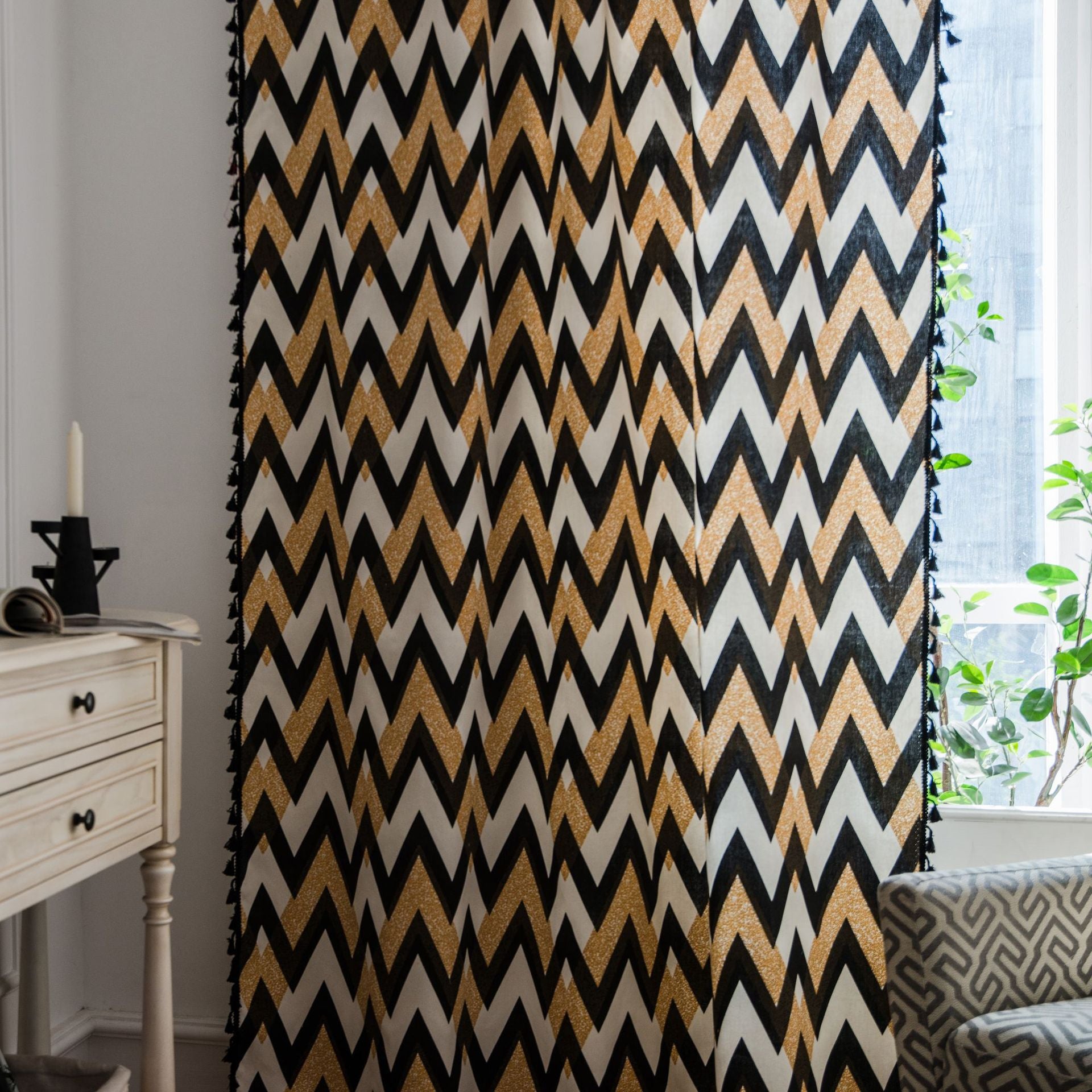 Adornadas com um deslumbrante estampado geométrico de ondas em preto e dourado sobre um fundo branco sólido, estas cortinas dão vida a qualquer ambiente.