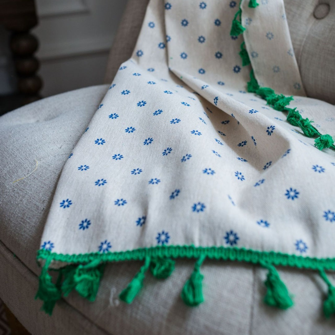 • Design: Cortina boémia marfim com estampa de flores de margarida azuis, acabamento verde, borlas verdes