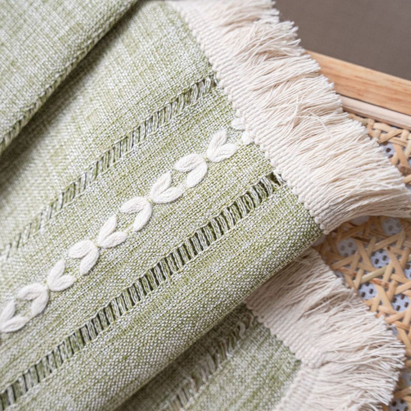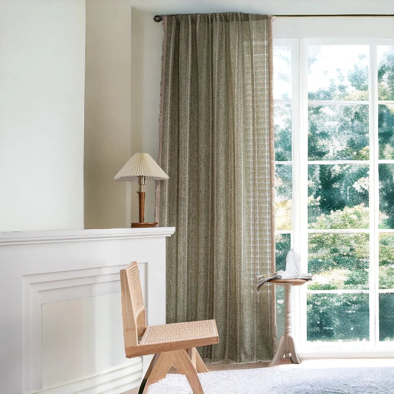 Exibindo um elegante estilo rústico, esta cortina verde sólida semi-transparente adornada com franjas cor de marfim na lateral e na parte inferior dará um toque vibrante e refrescante aos seus interiores.
